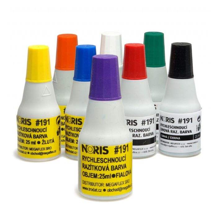 Noris 191 ist eine schnelltrocknende alkoholbasierte Stempelfarbe für Selbstfärber. Geeignet für glatte, nicht saugende Oberflächen. Vollständig trocken in 5 Minuten.